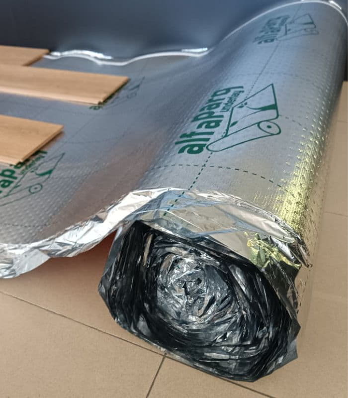 Suministro de base acústica Alfaparq Ixpe Radiant 2.0 mm de polietileno reticulado por radiación. Con una capa superior perforada y una capa inferior de barrera de vapor plateada reflectante. Colocación de la base sobre el sustrato soporte, cubriendo las uniones entre los tramos de rollos instalados con su propio solape autoadhesivo. Colocación del suelo directamente encima de la superficie de la base aislante siguiendo las instrucciones del fabricante.