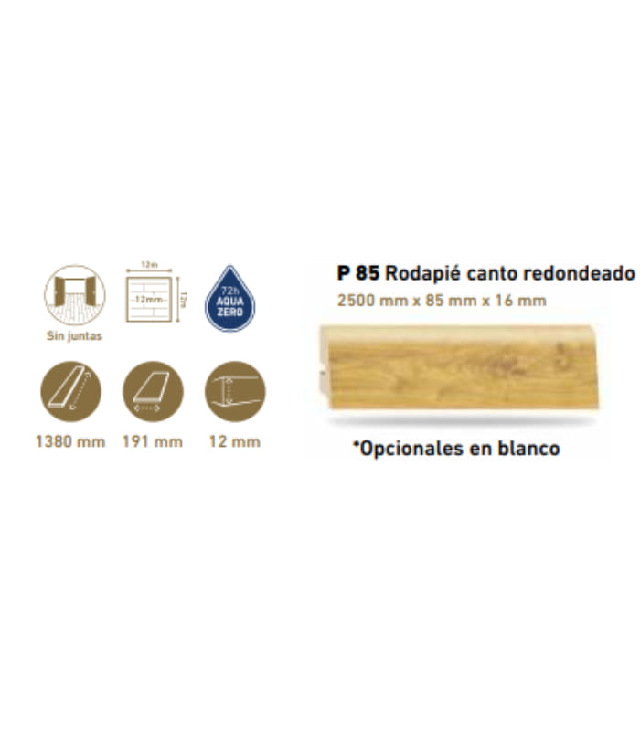 El rodapié de canto redondo D40404 en Roble Moderato es una opción elegante para complementar tus suelos. Con dimensiones de 2500 mm x 85 mm x 16 mm, proporciona una continuidad visual sin juntas visibles. Cada caja cubre 1,318 m² con 5 lamas, mientras que un palet abarca 79,08 m² distribuido en 60 cajas. Además, ofrece opciones adicionales en blanco con dimensiones de 1380 mm x 191 mm x 12 mm para adaptarse a diferentes estilos y necesidades de diseño.